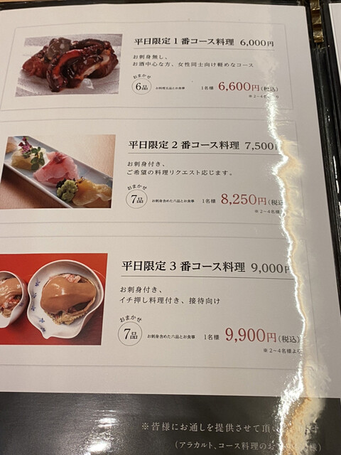 当店は小さい店です、お客様のお席がそんなにゆとり無く、なるべく取り皿などは出さないように1人づつお料理は分けてご提供させて頂いてます。価格で食べたい料理や興味ある料理を我慢したり、断念して欲しくない為と仕入れ原価が市場の都合で毎日変動する為、風紀を乱す輩には来店して欲しくない為、20年間料理の価格表示はしてきませんでしたが、お会計が不安なお客様が来店を見送る事になる為、2025年11月より価格表示していきます。