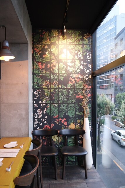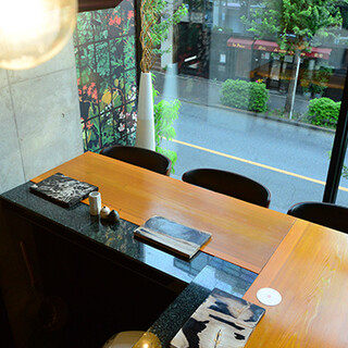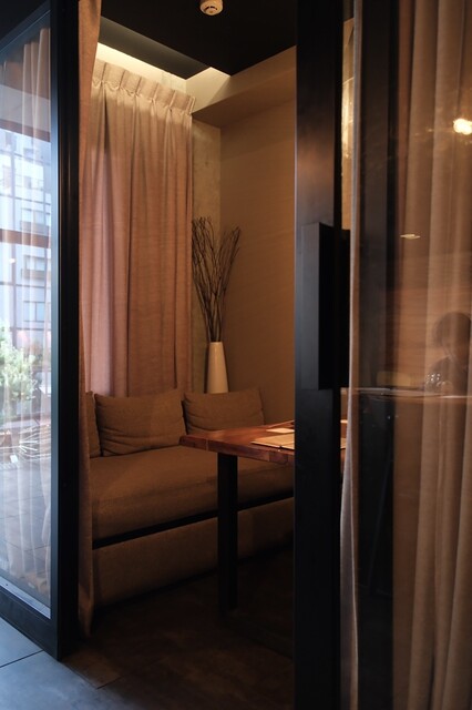 全20席の店内は、やわらかな照明が灯る、シックでモダンな空間。ガラス張りの窓から臨める恵比寿公園の緑が、都会の喧騒を忘れさせてくれます。広々としたカウンター席は、オープンキッチンの臨場感を楽しめる特等席。少々奥まっている最大4名様でご利用できるテーブル席は特別なひと時に最適です。最大6名様までの完全個室も完備しておりますので、記念日やカジュアルな接待など様々な機会にぜひご利用ください。