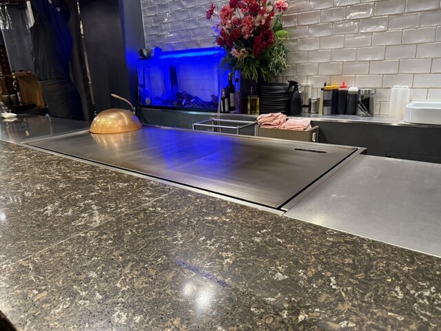 鉄板焼きならではの臨場感を愉しめるカウンター席。目の前で調理の様子を眺めながら、グラスを片手にごゆっくりとどうぞ。人気のお席ですので、お早めにご予約ください。