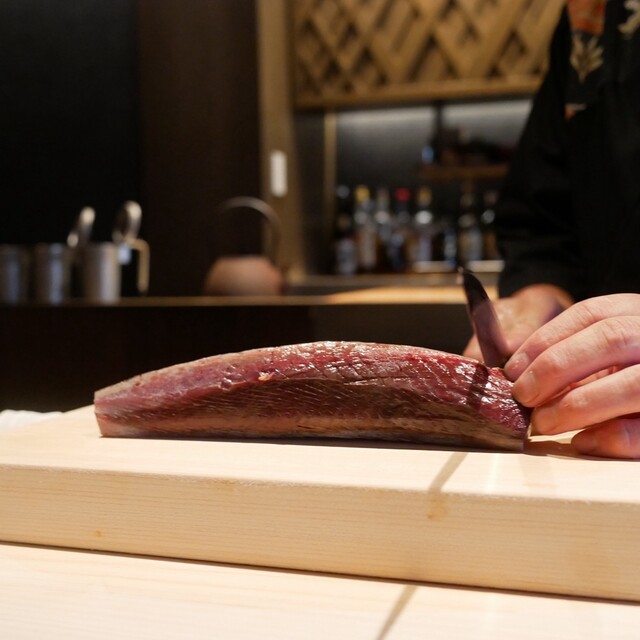 根津美術館のほど近くに店を構える【鮨m】。暖簾をくぐり店内へ足を踏み入れると、そこにはシックで洗練された空間が広がっています。お席は職人の技術や調理風景、ソムリエの所作を間近で見ることができる檜のカウンターが12席。心躍るライブ感を体感しながらお食事をお愉しみいただけます。誕生日や記念日をはじめ、ご褒美ディナーなどにも最適。上質な大人の空間で大切な方と美食を味わう、至福のひと時をお過ごしください。
