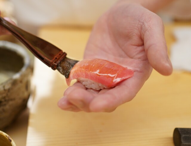 旬の食材を使ったネタは新鮮なものだけを仕入れており、日々変化いたします。一方、シャリは表面はしっかり中はふっくらと一粒一粒が際立つように炊き、乾燥米を配合することでプチプチした食感を創出。そこに赤酢など3種類の調味料をブレンドし、まろみのある味を出しております。「ゆっくりと江戸前鮨を楽しんでいただきたい」。そんな店主の思いと細部へのこだわりを、【おまかせコース】44,000円でご堪能ください。