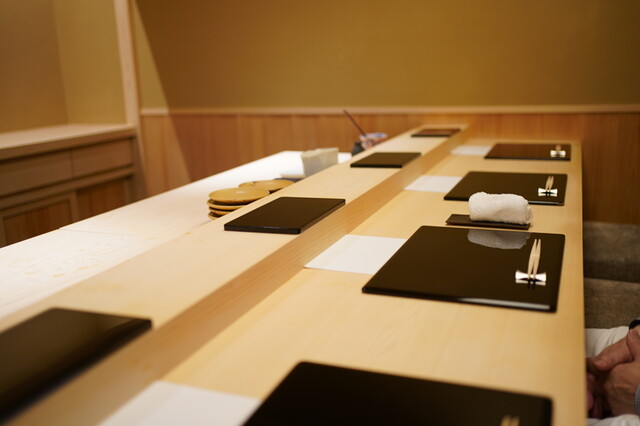 人通りの多い表参道の路地裏。閑静な住宅街の一角にたたずむ当店は、街並みに溶け込んだ外観から一転、中は美しいヒノキの一枚板を使用したカウンターが鎮座し、木目調のインテリアと相まって、シンプルで清潔感がありながら温かい雰囲気をかもし出しています。カウンター席では調理の様子を楽しみながら料理やお酒に舌鼓を打つことができ、特別感を味わえること請け合い。大切な人との会食やお祝い事などでのご利用にも最適です。