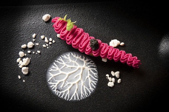 シェフの独創性と美的センスが炸裂する、色彩豊かなフランス料理。その一皿はまさに芸術作品のようです。可憐な見た目とは裏腹にインパクトのある味わいのものや、また逆に視覚を刺激しながらも舌に与える印象はあくまで繊細に…など、五感で愉しめるフレンチご提供。メニューは、昼は1,850円から、そして夜は5,800円のコースひとつだけと明快な設定ですので、フレンチが初めてという方もお気軽にご来店ください。