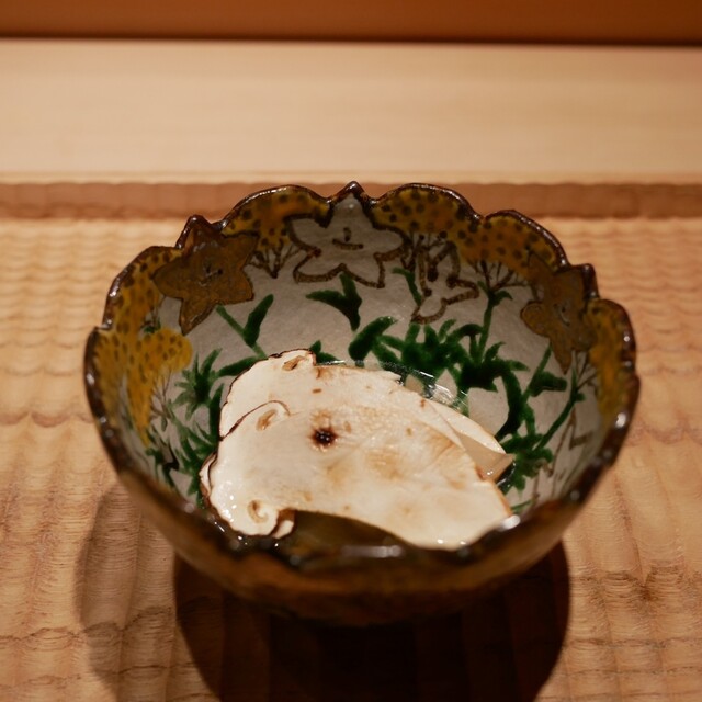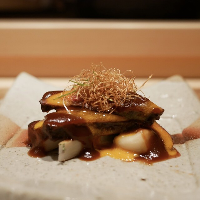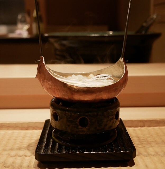 食材のポテンシャルを様々なアプローチで表現するのが、「伯雲」の真骨頂。椀物には指宿産の本枯れ鰹節を客前で削り、香り豊かな引き立ての出汁をかけて供する。「鱧と松茸の小鍋仕立て」では、松茸は傘は大ぶりに、軸は細やかな千切りにして、軟らかな鱧との食感のコントラストを表現する。見知った食材や料理でも、丁寧な仕込みと緻密な計算、カウンターならではのライブ感により、新たな一面を引き出してくれる。