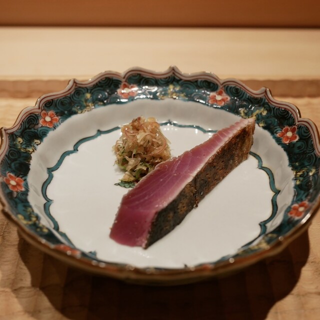 京都の長屋造りのようなアプローチを抜けた先には、低めに設置したヒノキの一枚板カウンターを配した客席が広がる。坂本氏が修業時代から収集してきた器類は、現代作家から骨董まで幅広いが、どれも遊び心と趣のあるものばかり。中でも目を引くのが、江戸切子作家・但野英芳氏の酒器。金魚や桜など美しい絵柄が刻まれた、デザイン性あふれる珍しい猪口や片口で、現在では入手困難な希少な逸品だ。