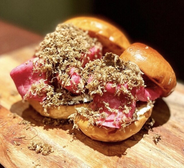 トリュフをこんなにかけるの?!と驚かれるほどに降り注ぐトリュフ。合奇苑に来たら食べずには帰れない逸品のトリュフたっぷり和牛スライダー!喉をするりするりと滑り落ちていく程に美味なる味!