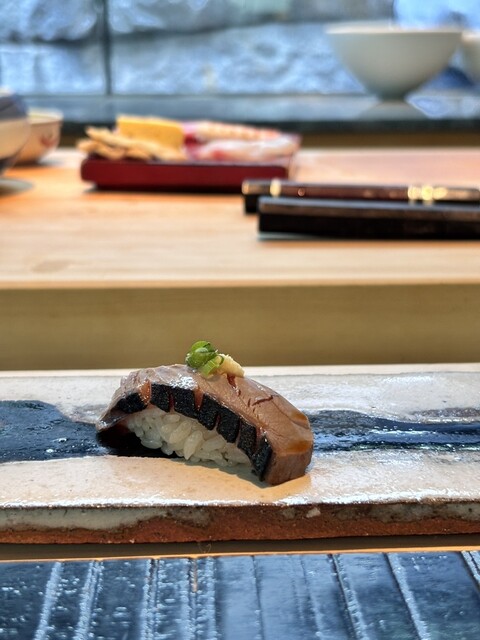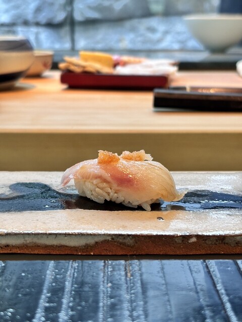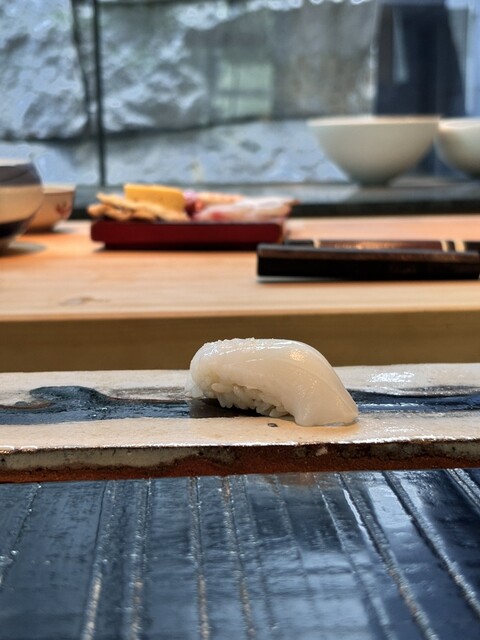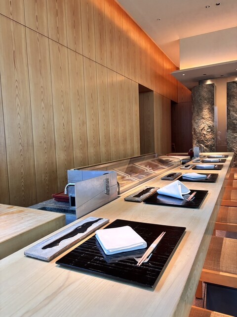 杉本貴志氏デザインの店内は、現代的でありながらも日本の伝統を表現し、庵治石や流水などが配された開放的で明るい空間。一本の吉野檜から切り出された寿司カウンターは、上質な自然の風合いが感じられます。