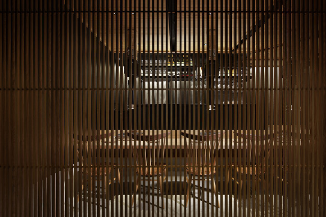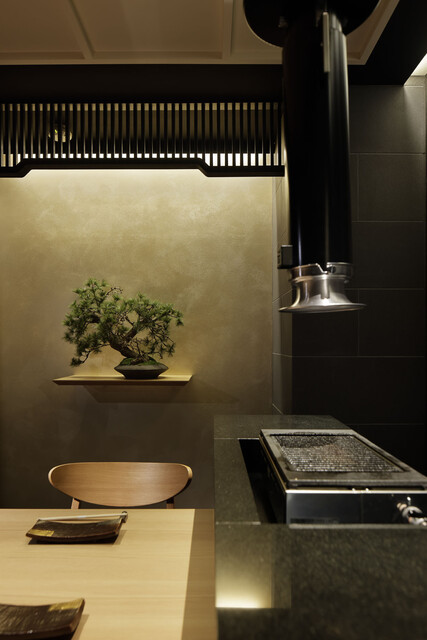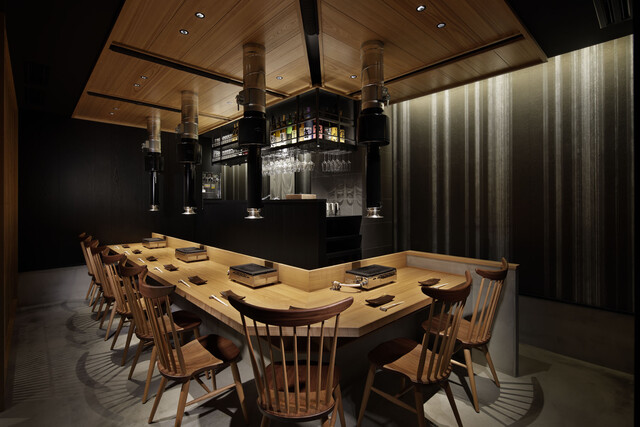 すべて2名様ずつの天井からロールスクリーン式のすだれがあり、仕切られたカウンター