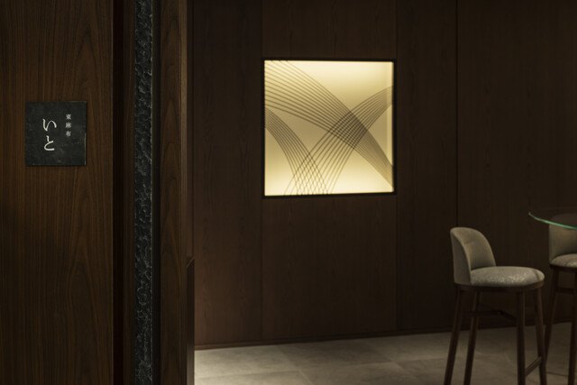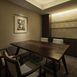 店内はアーティスティックなインテリアを配したモダンなデザイン。高級感溢れる落ち着いた雰囲気の中でゆったりお過ごしいただけます。木のぬくもりを感じるオープンキッチンのカウンター席に加え、プライベート空間でくつろげる個室も完備し、接待や会食にも最適。20時以降は、前室エリアでのワインバー利用が可能で、隠れ家的な空間で希少なワインをお愉しみいただけます。