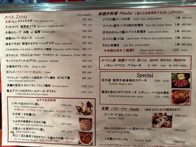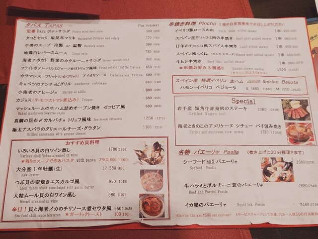 パエリア、肉料理、デザートL.O 22:00 ドリンクL.O22:30