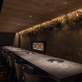 都会の喧騒を忘れさせてくれる静かな路地裏に佇む【焼肉思食】。イタリア製の高級家具カッシーナの椅子と匠の技で作り上げられた左官のテーブルの独特な手触りや壁の芸術品のような美しさとが韓モダンの非日常的な空間を演出します。1Fはカウンター席、2Fは完全個室をご用意しております。