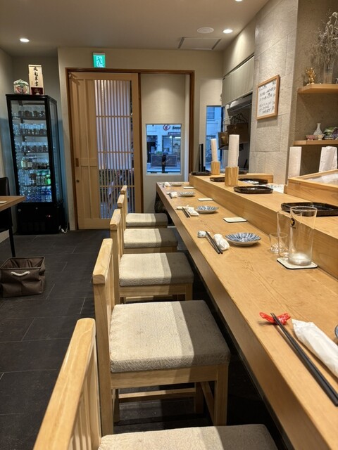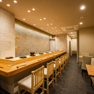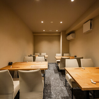 店内はカウンター8席、2名掛けテーブル1卓、4名掛けテーブル1卓、奥に4名掛けテーブル4卓の個室をご用意しております。会食や接待、団体様からお子様連れまで安心してご利用いただけます。