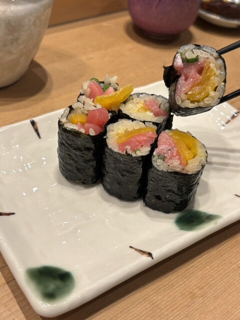 当店看板メニューの【四季の春巻き】は季節によってさまざまな組み合わせの食材を春巻きでご提供します。冬の一例(✨あん肝と大根✨生牡蠣と春菊✨白子と牛蒡の炊き合わせ)等、季節により個性豊かな組み合わせでご用意しております。鮨だけでなく、居酒屋としてお気軽にご利用もお待ちしております。