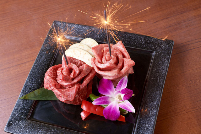お誕生日、記念日、お祝い、サプライズetc皆様の思い出の一片のお手伝いをさせていただきます。お肉をお花に見立てたプレートをご予約いただけます。甘いものが苦手な方、焼肉がお好きな方に大変ご好評をいただいております。コース詳細にて、お肉の花ケーキ付きのプランのご案内もしておりますので是非ご覧ください。