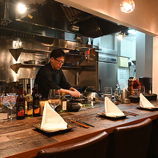 木目を基調とした店内は、間接照明が柔らかく照らす落ち着きのある空間。古材を使用した一枚板のカウンターでは調理風景を眺めることもでき、デートやおひとり様にも最適です。200本以上のワインが収納できるウォークインワインセラーの前にはテーブル席もご用意。2名様掛けと4名様掛けのお席は、連結させることで6名様までご利用可能です。貸切も承っており、立食であれば20名様ほどのパーティーもお楽しみいただけます。