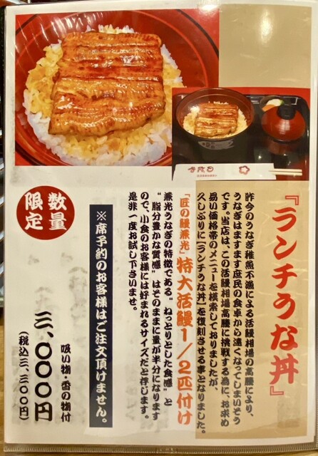 ※当店は活鰻調理の鮮度を重視して産地直送していますので、“順次売切れ”の「うな重」が都度ございますのでお早めのご来店をお勧め致します。