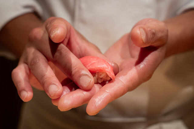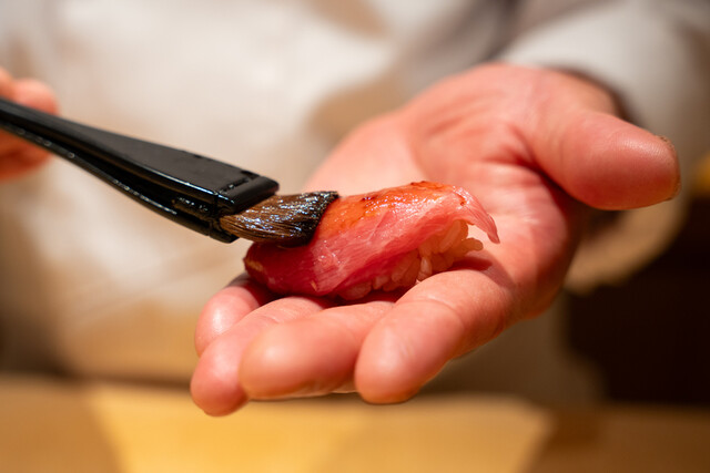 こだわりの鮨は、豊洲市場で最高級の鮪を取り扱う"やま幸"から仕入れる。魚には温度や食感にも気を配り最高のタイミングで提供してくれる。漁師からの直送朝採れ鮮魚を始め契約農園の新鮮な野菜、幾度と改良を重ねたオリジナルブレンド米で握る鮨は凛とした佇まい。