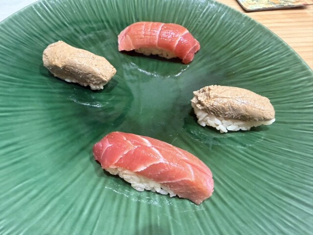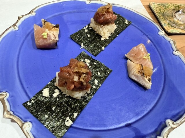 見た目のインパクトから期待値が上がり、うっすらと香るスモークの中身が見えるまで4分待つ。中身が見えてきたらふたを開けるとスモークの香りに嗅覚が刺激され食べても驚きの至高の一品見て楽しみ、香りで楽しみ、味わって楽しみ。。。まさに鮨のエンターテイメントと思わせるすしOmakaseの看板メニュー中身は生サバが中心だが、趣向によって他のネタが出てくるときも。お楽しみに。