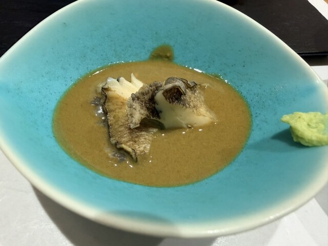 酒以外の調味料を一切使わず、長時間炊いた柔らか煮鮑を鮑の塩気だけで整え肝ソースで食す。残った肝ソースに入れるのは3種類の赤酢をブレンドした長野県上田産の無農薬コシヒカリブレンド。