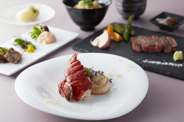くまもと黒毛和牛プレミアム「和王」をはじめ、活伊勢海老、活鮑などの新鮮な魚介類などの素材を匠の技で華麗な一皿に仕上げます。