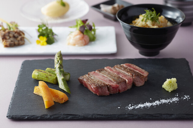 鉄板焼の主役である“肉”にこだわり、「松阪牛」、「神戸牛」とあわせ、関東圏では希少なブランドとされる熊本県産の黒毛和牛プレミアム「和王」を使用しています。とろけるような肉質と柔らかで芳醇な味わいを持つプレミアムな黒毛和牛がお召し上がりいただけます。