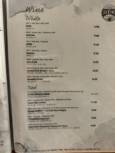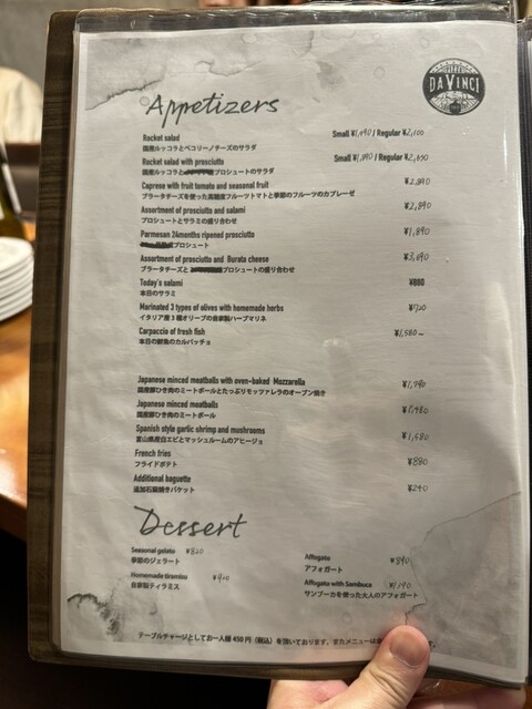 テーブルチャージ490円税込み(ディナー),ランチ360円テーブルチャージ