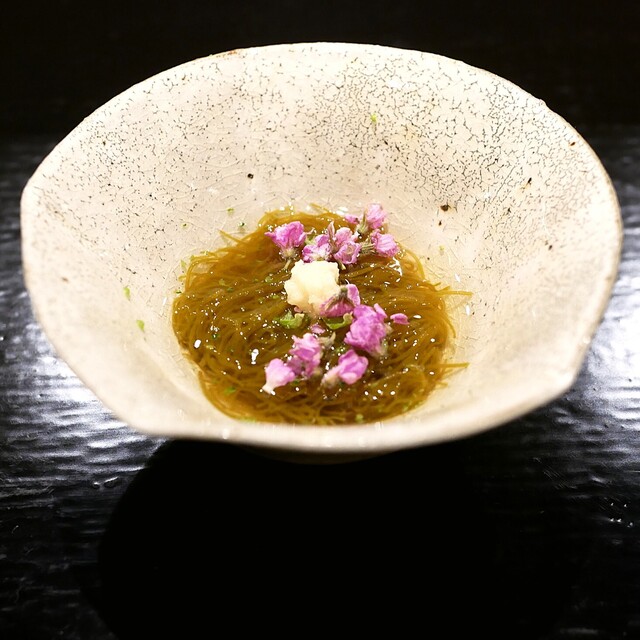 久し振りに白金高輪の島津さんにお伺いして来ました。 昨年から今年にかけてのゴタゴタで、なんと1年以上もご無沙汰してしまいました。 久々過ぎて緊張してましたが、大将も女将さんも二番手さんも、皆さん笑顔で出迎えていただき感謝です。 ・先付 能登の水雲と愛知・祖父江の銀杏「藤九郎」 ザク...