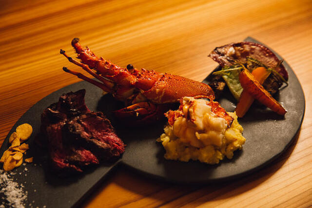 写真は伊勢海老、和牛、自然野菜を盛り合わせた鉄板料理名物「眞かプレート」です!全国の伊勢海老を見て回り、紀伊長島、三崎港、南伊豆と質や思いの通じあった漁師さんや伊勢海老専門業者さんから天然伊勢海老を仕入れています。伊勢海老のお造り、黄金焼き、甲羅焼きと食事に華を添えるような王道料理は会食や接待、お祝い事などから少し贅沢な日常使いまで幅広く愉しめます。伊勢海老料理の単品注文も可能です!