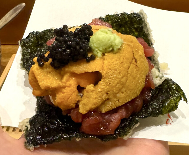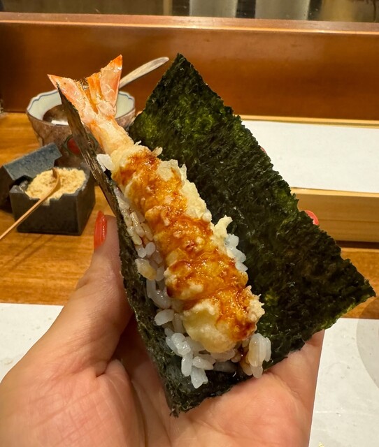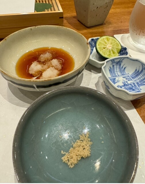 時期により最良な素材を使用したコースでご提供します。天ぷらだけでなく、かつお出汁にこだわった季節のお椀、和食の板前経験を活かしたお造りや一品を間に挟み、飽きのこない構成にしております。お酒は、毎月異なるコースに合わせワインや日本酒をご用意しております。天ぷらは見た目の美しさや所作はもちろんのこと、特に口にされた時のバランスを考えた、温度・熟成・食感にこだわってご提供いたします。
