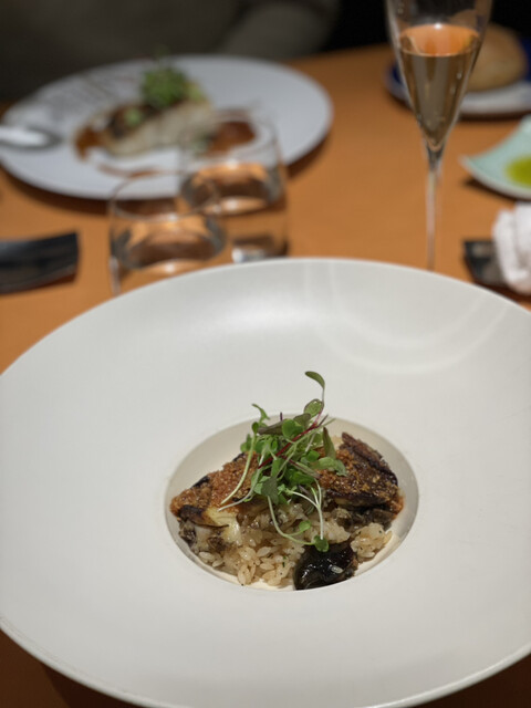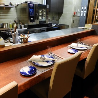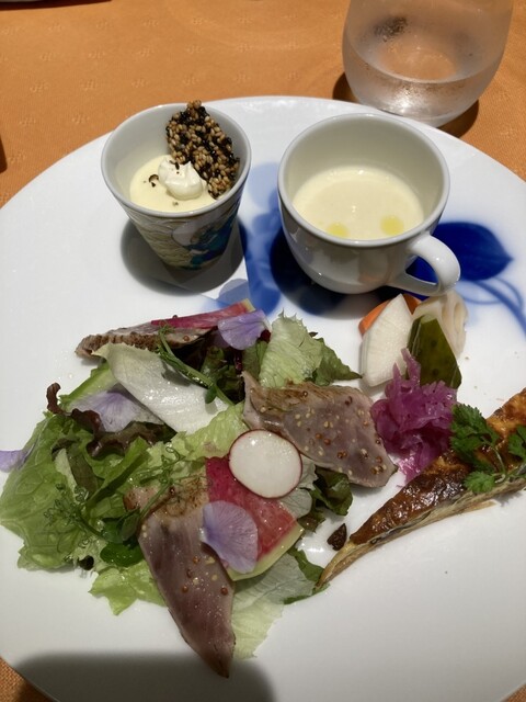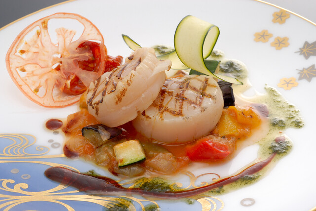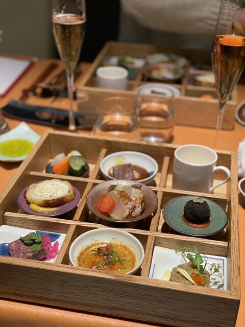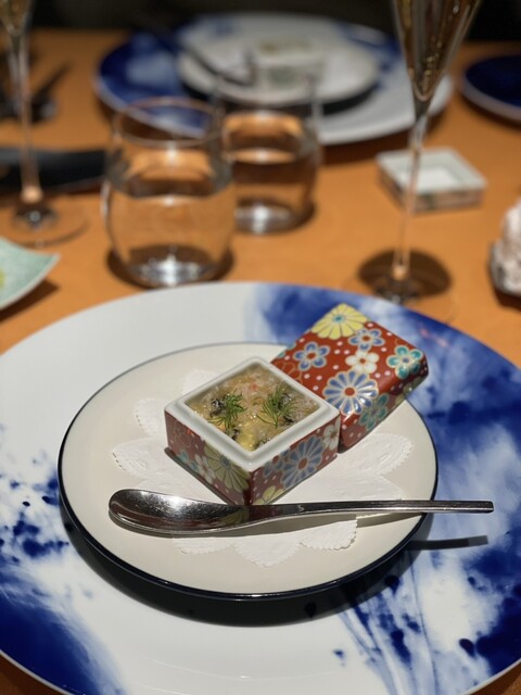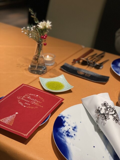 木目のブラウンと日本古来の藍色を基調とした落ち着いた空間で、ゆったりとリラックスしてお食事いただけます。また、器は久谷焼や大倉陶園といった高級食器を使用。シックで洗練された雰囲気にカジュアルさが同居する空間の中で、和フレンチのお料理と、それを引き立てる和食器をご堪能いただけます。非日常の贅沢を、普段使いでも気軽にお楽しみください。