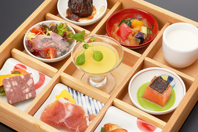 四季折々の旬の料理を少しずつたくさん味わえる「オードブル盛り合わせ9品目」は、女性に大人気の一品。2ヶ月に1度内容を変更しておりますので、春夏秋冬で新しい味に出会えます。また、盛り付けも可愛らしく、どれから食べようか迷ってしまう華やかさ。その時期限定の味を、目と舌でぜひお楽しみください。
