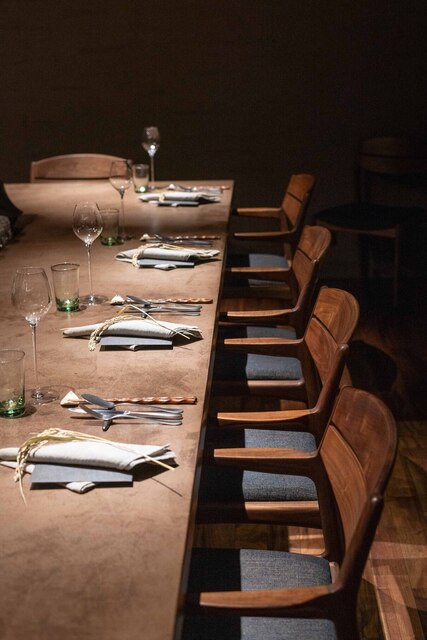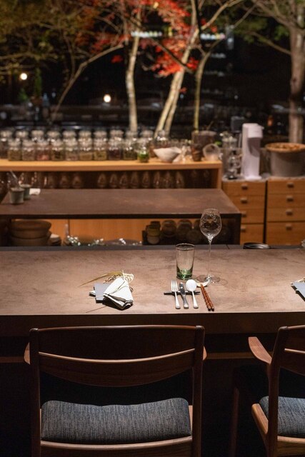森の中にひっそりと佇むレストラン。店内の大きな一枚窓からは、四季折々の森の風景が広がります。落ち着きあるモダンな空間には、カウンター9席を完備。シェフやソムリエの洗練された所作を間近で味わえる臨場感も楽しみのひとつです。6名様から貸切も可能。特別なひとときをお過ごしください。